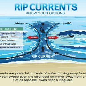Rip currents are powerful currents of water moving away from shore. They can sweep even the strongest swimmer away from shore. If at all possible, swim near a lifeguard. Read More