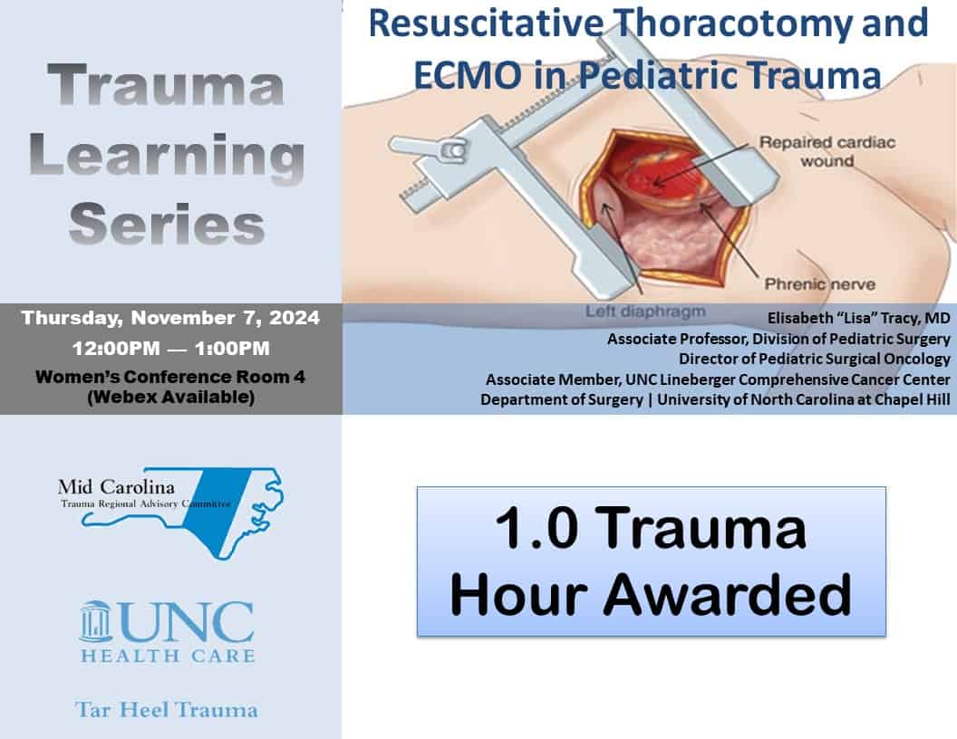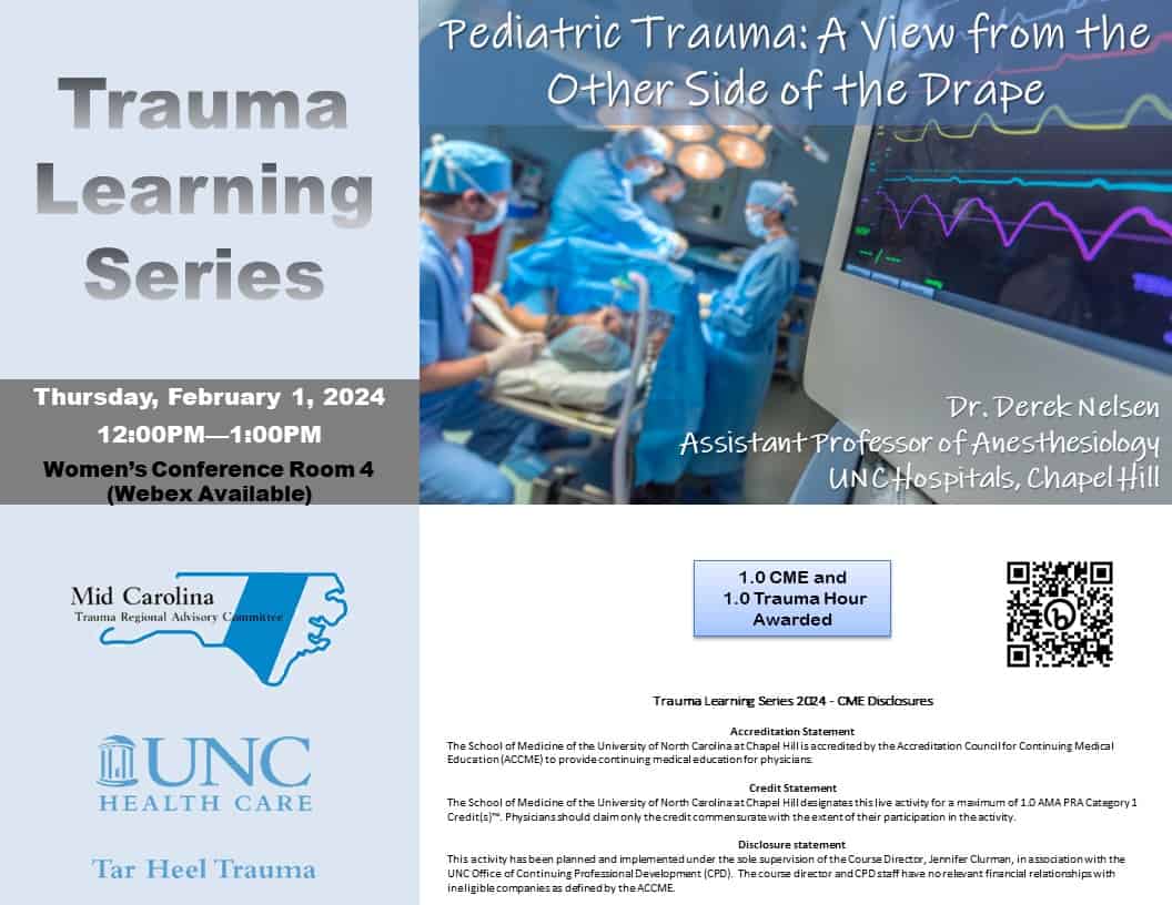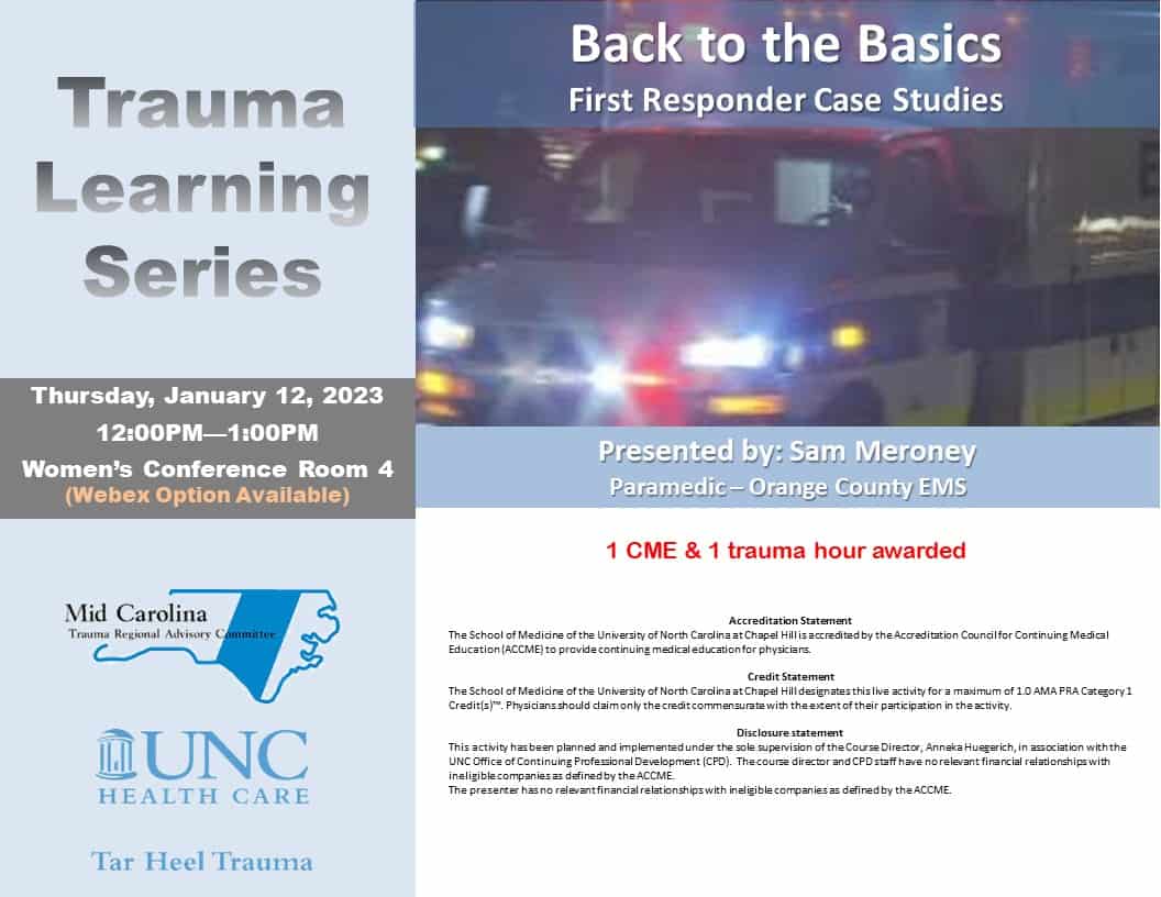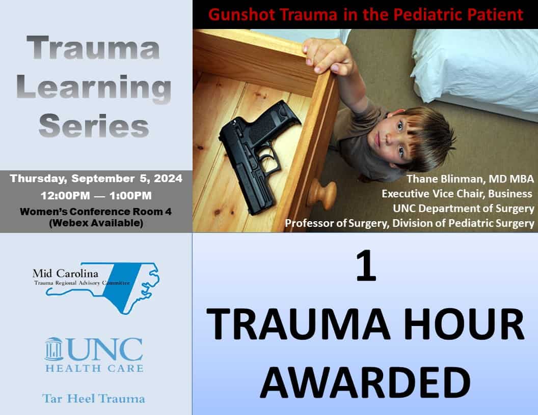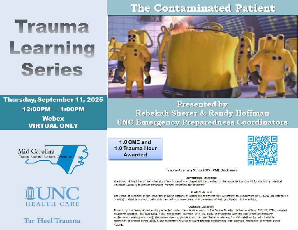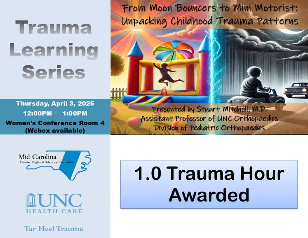 The Tar Heel Trauma Learning Series is a monthly, one-hour educational aimed at improving trauma knowledge and care at UNC and across the region.