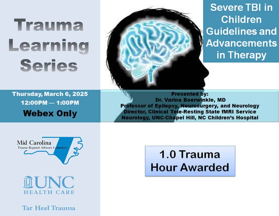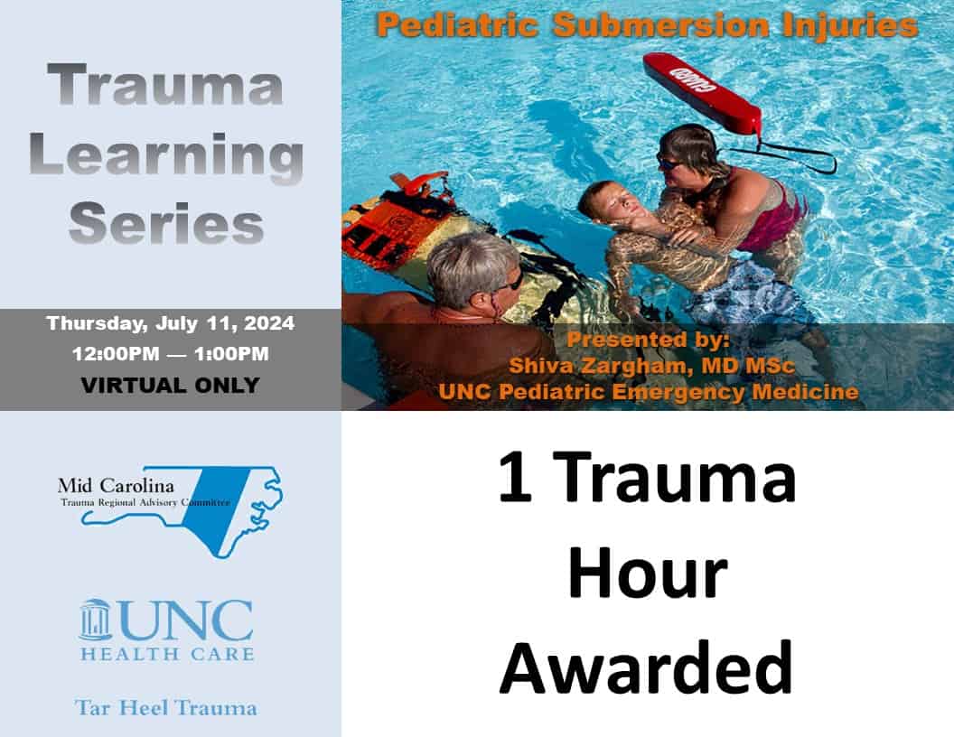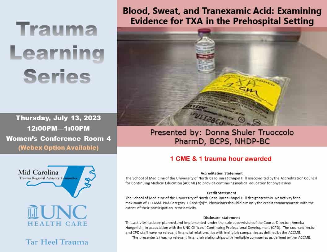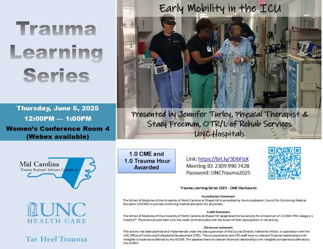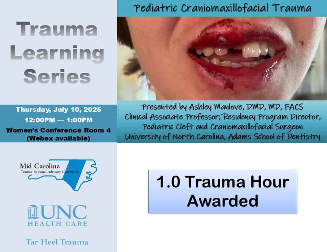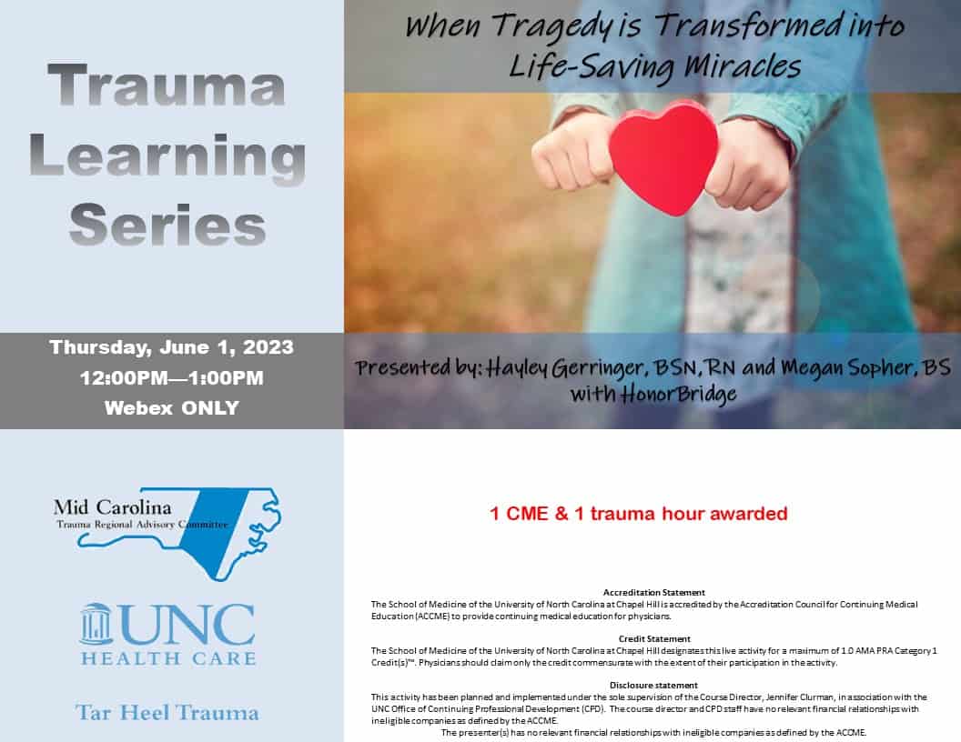 The Tar Heel Trauma Learning Series is a monthly, one-hour educational aimed at improving trauma knowledge and care at UNC and across the region.