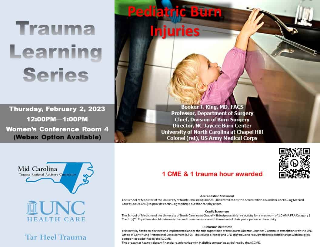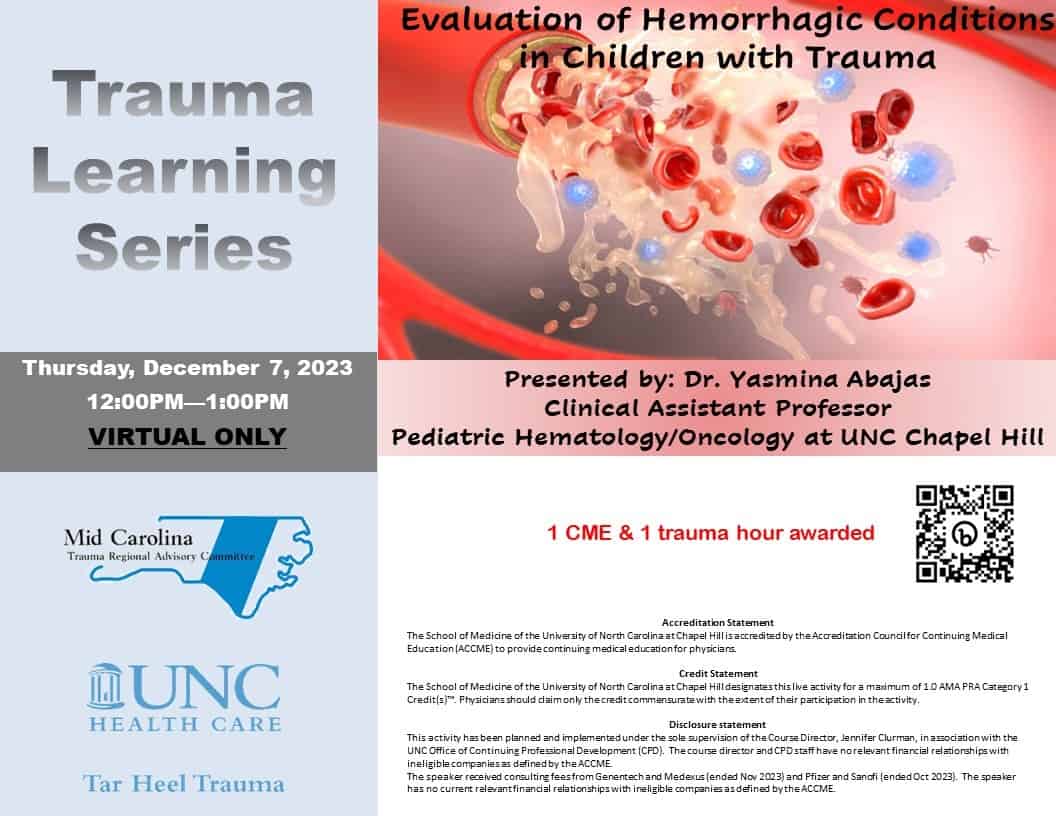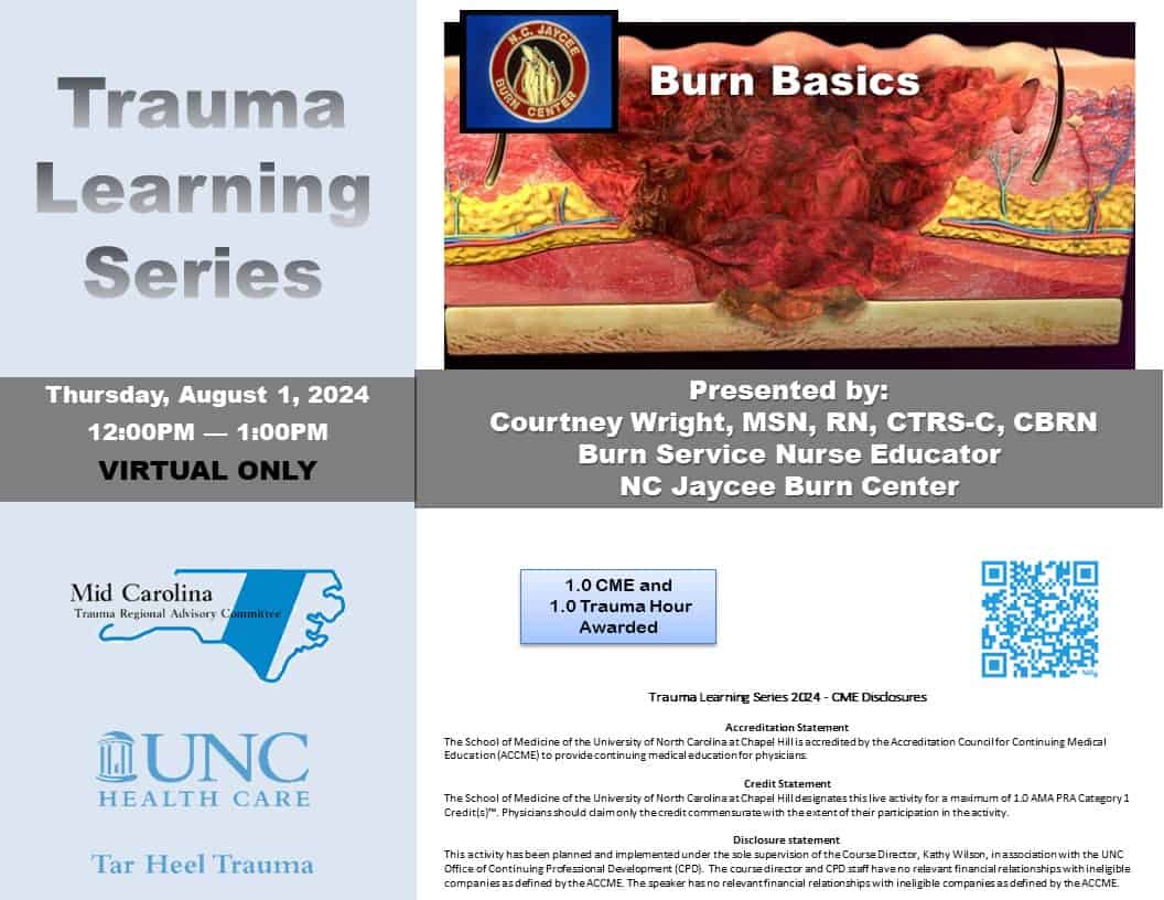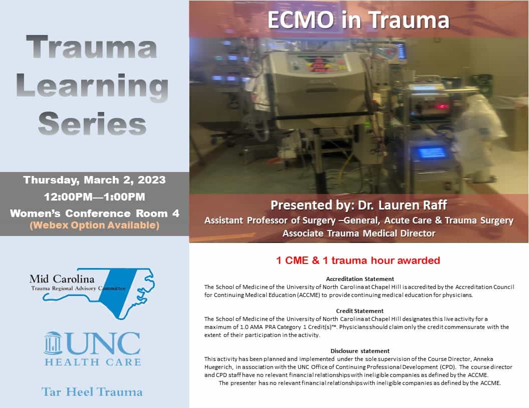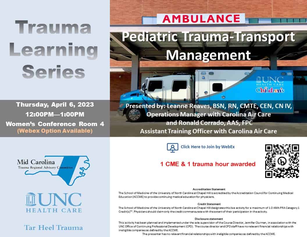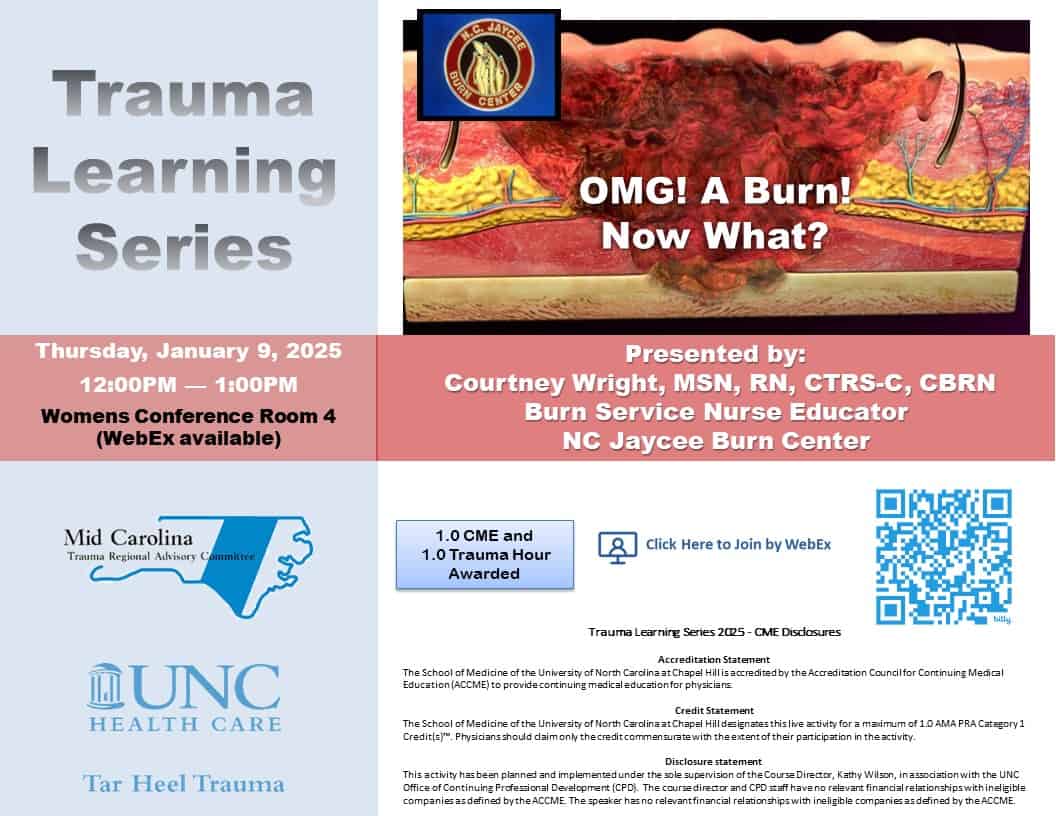 The Tar Heel Trauma Learning Series is a monthly, one-hour educational aimed at improving trauma knowledge and care at UNC and across the region.