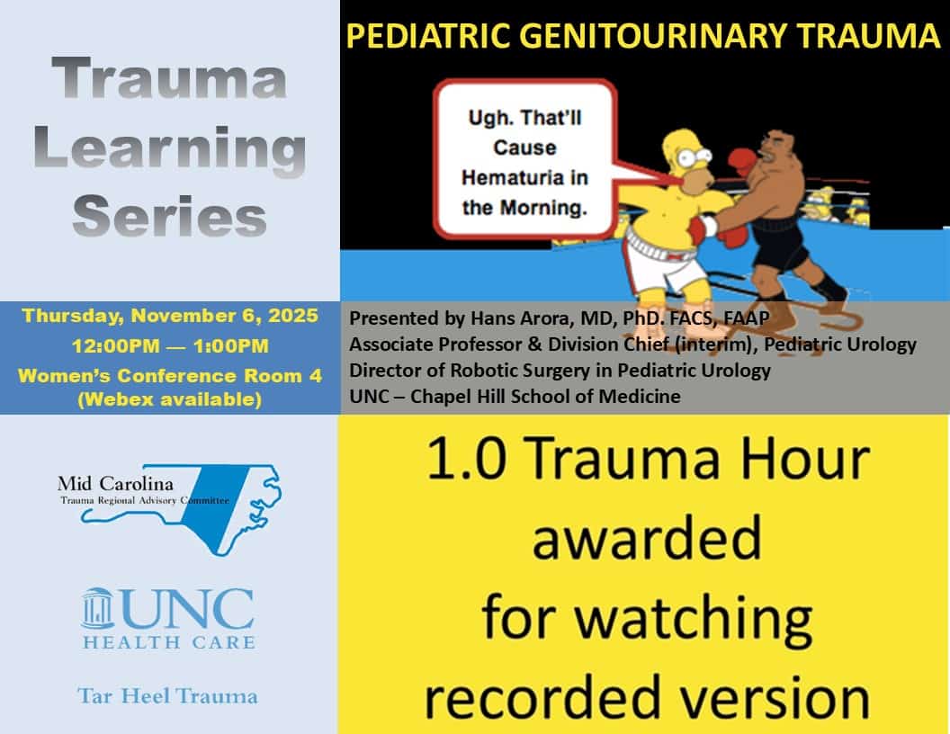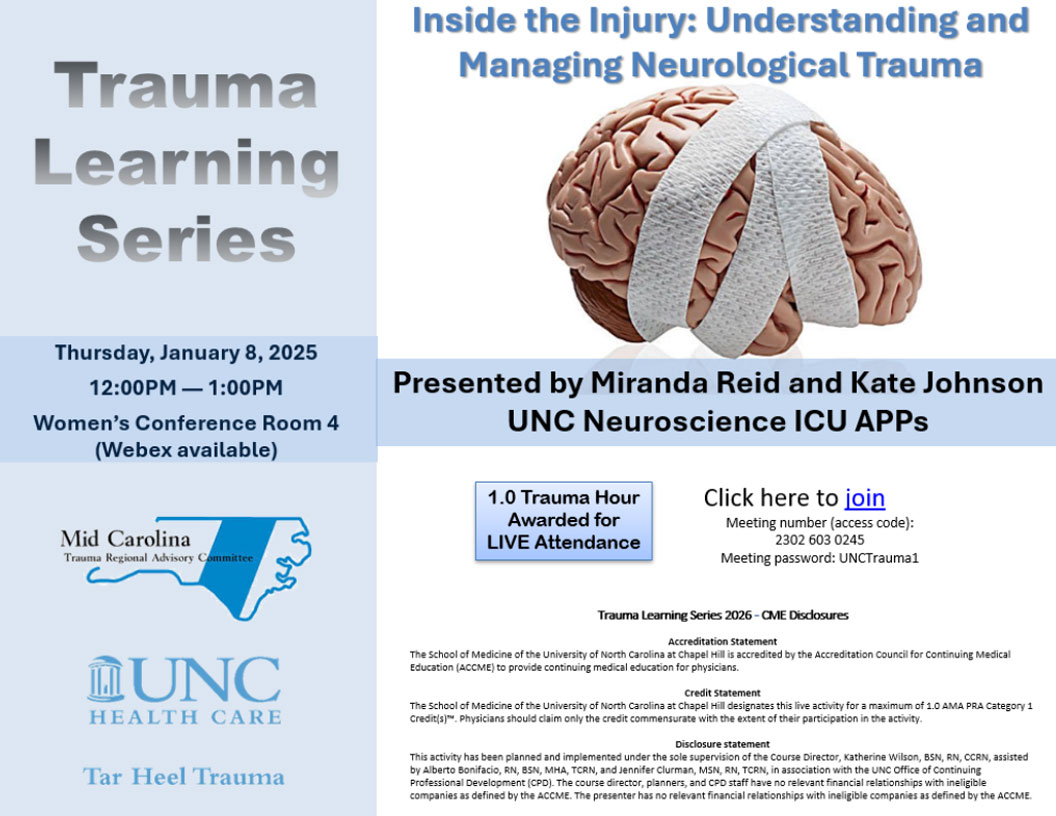 The Tar Heel Trauma Learning Series is a monthly, one-hour educational aimed at improving trauma knowledge and care at UNC and across the region.